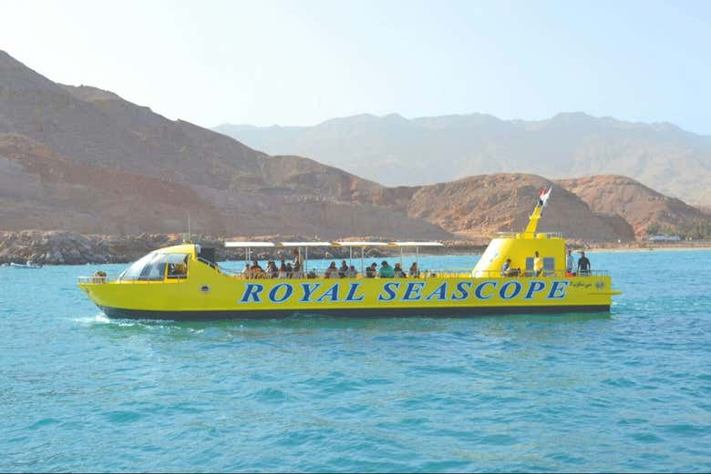 As soon as we board, you'll be greeted with a welcome drink. After this, we'll set sail along Ain Sokhna's coastline while you enjoy a pleasant trip onboard. The boat has two floors: a top level where you'll get to enjoy the sea breeze, and a lower level that goes 3 metres (9.8 feet) underwater.