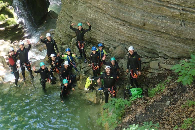 Following this, we'll gear up and start our route along the interior of a canyon river in the heart of the Aragonese Pyrenees. Don't forget to take in the sprawling natural landscape surrounding us! With the help of ropes, we'll take on impressive slopes and natural ramps for a unique challenge. We'll also traverse over rocky paths and jump into crystalline pools below.