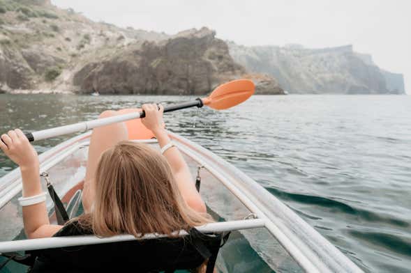 Equipped with our new basic knowledge, we'll make our way to Levante Beach, where we'll kick off our clear kayak adventure in Cabo de Palos. This picturesque destination in the Murcia region boasts enchanting small coves and breathtaking cliffs that are sure to leave you in awe – be sure to have your camera!