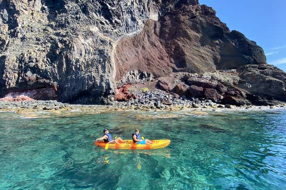 When we arrive at our destination, we'll swap the speedboat for a kayak and start enjoying the Madeira coastline while paddling through the crystal clear waters. We'll have a blast! During the kayak tour, we'll admire the imposing cliffs of Ponta de São Lourenço and witness the power of the Atlantic Ocean crashing against the rocks.