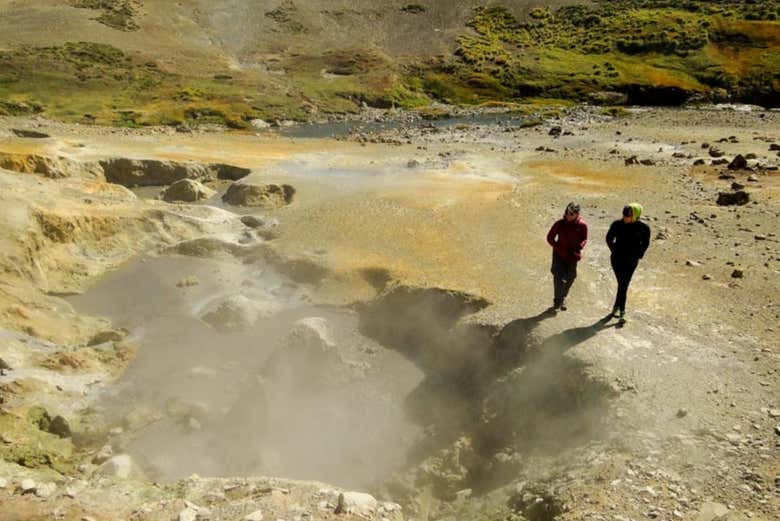 We'll continue our journey and, after 30 minutes approximately, we'll reach Las Máquinas. Here, we'll wander amongst fumaroles and boiling springs. Did you know that this area is named Las Máquinas (The Machines) because the sounds emitted by the Earth are similar to those of steam engines? It's such an impressive place!