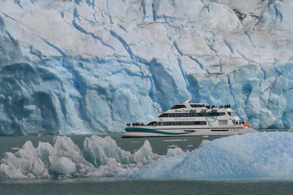 With an exclusive view from the premium cabin, located at the top of the ship, you'll be able to see all the main highlights of Los Glaciares National Park. First, we'll stop in front of the Seco Glacier, which is in retreat, so you can see an ancient strip of eroded land. Then, the cruise will continue towards the Heim and Spegazzini Glaciers. Did you know that the latter glacier reaches about 443 feet (135 meters) high?