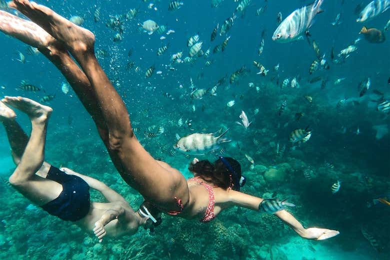 During the cruise, we'll make two stops to snorkel for 40 minutes each, where you'll explore the coral reefs and admire the rich underwater fauna of the Red Sea. We'll also visit Dolphin House, an area known for having friendly dolphins. Can you imagine swimming next to them? Amazing!