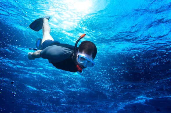 Once we've arrived, we'll put our wetsuits on and explain some safety rules that you'll need to follow during the activity. We'll get our flippers, snorkels and goggles on and jump into the water so we can start exploring the beautiful seabed. 3, 2, 1, Splash!