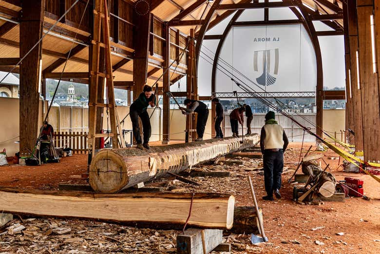 Based on images provided by the famous Bayeux Tapestry, a group of carpenters and other professionals are building this imposing Norman ship under a huge shed.