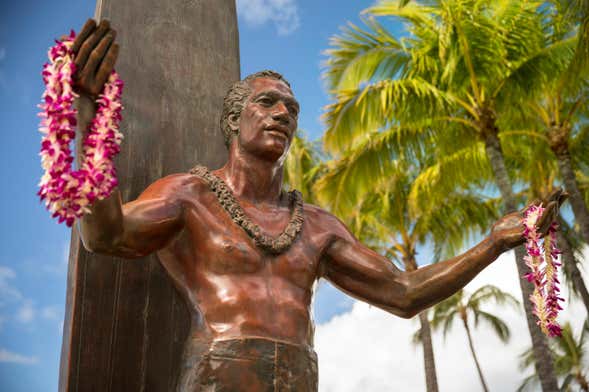 Strolling along the coast we'll come across the sculpture of Duke Kahanamoku, an Olympian athlete born in this city and considered the founder of modern surfing. We'll also see the monument commemorating Prince Jonah Kūhiō, providing the perfect opportunity to delve into Waikiki's past in connection with the monarchy.