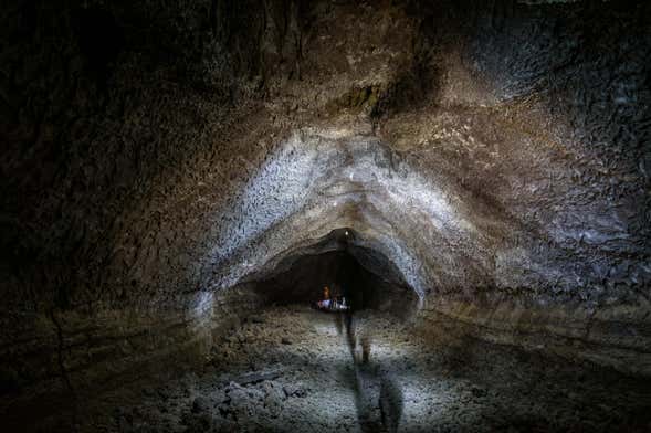 We will explore hardened lava flows as we head towards the entrance of the grotto to dig into its origins. The cave was formed in 1949 after the eruption of the San Juan volcano and we'll explain the unusual volcanic process that produced this tunnel, almost half a kilometre in length!