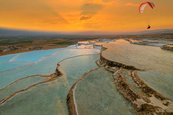 During the activity, we'll soar over Pamukkale's white terraces and the hot springs that form from them. You'll also get to see the remains of the ancient city of Hierapolis.