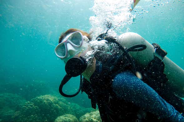 Firstly, we'll take part in a theory class to learn about diving. From the language to help us communicate underwater to the best techniques to enjoy the activity in the safest way possible. Later on, we'll make our way to the coast and enter the water in a tranquil area for the dive, where we'll dive to a depth of 1 metre (3.2 feet). The perfect way to be introduced to the depths!