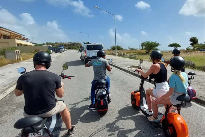 At the indicated time, we'll meet in the parking lot of the Zanzibar Restaurant, near Jan Thiel Beach, where we'll listen to a brief safety introduction and assign you the electric scooters. Let's go!